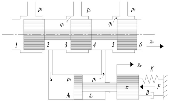 In the electro-hydraulic servo system, compared with the symmetrical hydraulic cylinder, the asymmetrical cylinder has the advantages of occupying a small space, being a simple structure and having a low cost, so it is widely used. In this paper, a four-way three-position (4/3) valve-controlled asymmetric hydraulic cylinder was used as the power mechanism of the electro-hydraulic servo system; the structure diagram of the valve-controlled asymmetric hydraulic cylinder is shown in Figure 1.