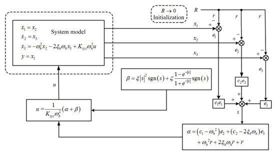 In Equations (19)–(21), the controlled object is the third-order system, and is the system’s state variable. is the piston displacement of the cylinder; is the piston velocity of the cylinder; is the piston acceleration of the cylinder; is the system’s control input; and is the system’s output.