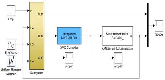 It can be seen that the electro-hydraulic position servo system designed in this paper can reach the sliding surface in a limited time. The schematic diagram of the SMC system based on the adaptive reaching law is shown in Figure 2. The AMESim/Simulink co-simulation block diagram is shown in Figure 3.