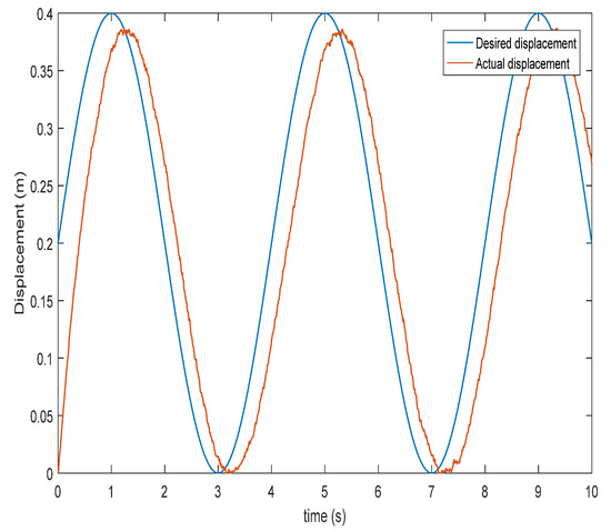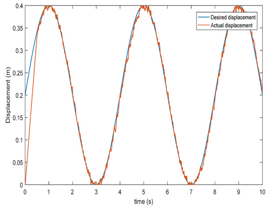 A bounded white noise interference signal was added to the given sinusoidal signal, and the exponential reaching law and the adaptive reaching law SMC controllers were used for the simulation, respectively. It can be seen from Figure 7 and Figure 8 that the displacement tracking effect of the adaptive reaching law SMC algorithm is obviously better than that of the exponential reaching law SMC algorithm, after being disturbed. The proposed adaptive reaching law SMC controller improves the robustness of the system.