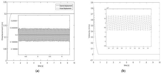 Giving a step signal, we used the SMC algorithm based on the exponential reaching law and the SMC algorithm based on the adaptive reaching law to simulate the piston displacement trajectory and piston velocity trajectory. It can be seen from Figure 9 that the SMC algorithm based on the exponential reaching law can make the piston reach a given position, but there is buffeting, the piston displacement buffeting range is ±0.0005 mm, and the piston velocity buffeting is ±0.0001 m/s. It can be seen from Figure 10 that the chattering range generated by the SMC algorithm based on the adaptive reaching law makes the piston reach the given position at ±0.0002 mm, compared with the SMC algorithm based on the exponential reaching law, where the chattering is only two-fifths of that when using the exponential reaching law, and the piston velocity buffeting is ±0.00003 m/s, only three-tenths of the velocity buffeting in Figure 9. The convergence velocity of the adaptive reaching law is faster than that of the traditional exponential reaching law. In addition, when the piston reaches the sliding mode surface, the buffeting of the system can be adaptively adjusted according to the system state variables, and finally converges to the equilibrium point of the electro-hydraulic position servo system. It can be seen that the SMC algorithm using the adaptive reaching law can obviously weaken the chattering problem caused by the SMC algorithm using the traditional exponential reaching law, the chattering of the piston displacement and velocity is obviously reduced, and the system still has a good tracking.