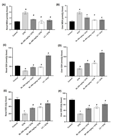 The effects of (GTN), (GTN + BL (200 and 400 mg/kg)), and (LC + GTN) on antioxidant enzyme activities after treatment. MDA in renal tissue (A) and liver tissue (B). GSH in renal tissue (C) and liver tissue (D). SOD in renal tissue (E) and liver tissue (F). Results represent the mean ± SD. * Shows a significant difference (p < 0.01) compared to the control; # represents a significant difference between GTN and the other treatment groups. Broccoli leaf extract (BL), malondialdehyde (MDA), glutathione (GSH), superoxide dismutase (SOD), L-cysteine (LC) Gentamicin (GTN).