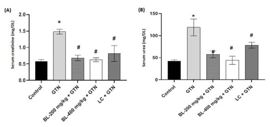 The serum creatinine and urea levels were evaluated, and the results are presented in Figure 3A,B. Our results showed that GTN significantly increased (p < 0.001) the level of serum creatinine. Treatments with BL (200 and 400 mg/kg) after the administration of GTN decreased the serum creatinine levels, similar to the control group, in a significant manner (p < 0.01). Overall, all treatment groups after GTN induction showed markedly reduced serum creatinine levels (Figure 3A). In the case of serum urea, treatments with BL (200 and 400 mg/kg) after the administration of GTN significantly decreased (p < 0.001) its level. The effects of BL produced levels that were very similar to the control, supporting the antioxidant activity potential of the extracts (Figure 3B).