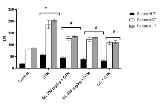Figure 4 shows the levels of the liver enzymes AS, ALT, and ALP under the GTN, BL (200 and 400 mg/kg), and LC treatments after the administration of GTN. The results indicated that GTN increased the levels of ALT, AST, and ALP compared to the control. Although the treatments with BL and LC in the presence of GTN produced a significant difference (p < 0.01) compared to GTN alone, the control enzyme levels were lower in all groups.