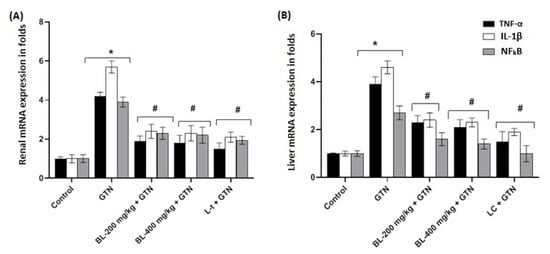 The renal and liver mRNA expression levels of TNF-α, IL-1β, and NFkB were evaluated, and the results are presented in Figure 5A,B. Figure 5A shows that the renal mRNA expression levels of TNF-α, IL-1β, and NFkB were elevated significantly (p < 0.001) in the GTN-treated group compared to the control and showed significant decreases in treatments with BL (200 and 400 mg/kg) + GTN. In Figure 5B, the liver mRNA expression levels of TNF-α, IL-1β, and NFkB showed a similar pattern to that of the renal mRNA cytokine expression levels. However, the results also indicated that IL-1β expression was higher in all GTN treatment groups compared to the control for both the renal and liver mRNA expression levels. Overall, the results indicated that treatments with BL (200 and 400 mg/kg) after GTN induction also appeared to reduce the mRNA expression levels of TNF-α, IL-1β, and NFkB in a similar fashion in both tissue types.