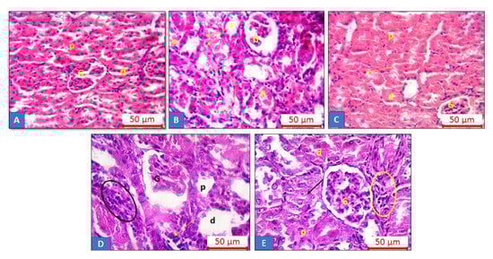Kidney tissue samples from each rat were harvested; then, the specimens were fixed in Blouin’s Solution, dehydrated in ascending degrees of alcohol, cleared with xylene, rapidly embedded in paraffin wax, and sectioned (5 µm thickness). The sections were stained with H&E []. The prepared slides were then examined under light microscopy (Olympus CX23LEDRFS1, Olympus, Tokyo, Japan) to study the histopathological changes.