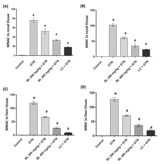 Histogram showing the morphometric results of the renal and liver sections indicating MNAC in renal tissue (A), MNIC in renal tissue (B), MNAC in liver tissue (C), and MNIC in liver tissue (D). Data represent the mean ± SD (n = 6). * represents a significant difference (p < 0.05) from the control group, while # shows a significant difference from the GTN treatment group. Broccoli leaf extract (BL), L-cysteine (LC), Gentamicin (GTN), mean number of apoptotic cells (MNAC), and mean number of inflammatory cells (MNIC).