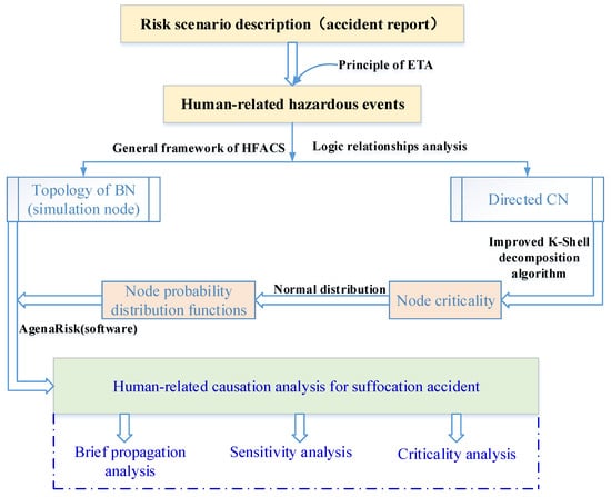 In the present study, a novel methodology integrated by CN and BN is proposed to investigate the human-related hazardous events involved in the suffocation on ships from the perspective of the complex social–technological system. The general principle for the proposed methodology is illustrated in Figure 1, and there are four main steps for its implementation.
