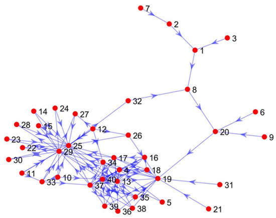 where and represent the set of nodes and the set of edges, respectively. In the present study, indicates the identified hazardous event, while denotes the logic relationship. Then, an adjacency matrix A is employed to quantitatively describe , and the elements in the adjacency matrix are determined by: