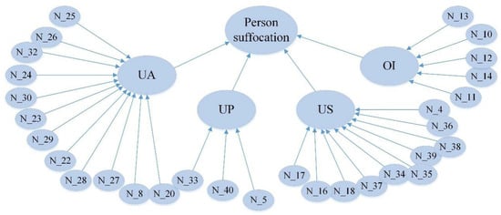 According to the category illustrated in Table 5, the “N_19” node (personnel suffocation) is regarded as the top node in the BN; the four aspects of HFACS are considered as the intermediate nodes; and the nodes contributing to every aspect of the HFACS are set as the root nodes. As a result, the basic framework of the BN is developed as shown in Figure 3.