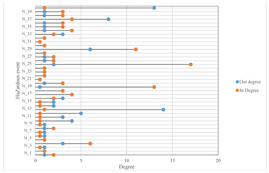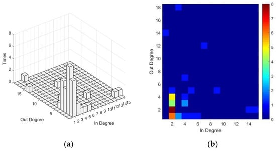The phase diagram of Figure 4b is essentially the projection of Figure 4a along the Y–Z axis. Based on the contents of Figure 4, the in-degree and out-degree of most nodes are less than 4, and the number of nodes with is found to be larger than other nodes. In addition, some nodes illustrated in Figure 4 are supposed to receive significant attention. For instance, the nodes with large in-degree are characterized by being caused or affected easily, which indicates that these nodes are difficult to control; meanwhile, the nodes with large out-degree are capable of affect other nodes easily, which shows that these nodes are important in improving the safety level. To distinguish the nodes with different in-degree and out-degree, the degrees for the nodes involved in the CN are then calculated, and the results are illustrated in Figure 5.