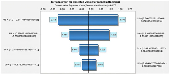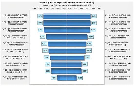 The sensitivity analysis was implemented in the present study to quantify the sensitivity of the identified human-related hazardous events to the personnel suffocation accident using the backward-propagation analysis of the developed BN. During the sensitivity analysis, the top event, which refers to the personnel suffocation, was set as the given evidence, and the developed BN was simulated with AgenaRisk. In the present study, sensitivity nodes were selected according to the node criticality, and the top ten root nodes were considered as the sensitivity nodes for the sensitivity analysis. The mean value of the target node (referring to personnel suffocation) was selected to indicate the summary statistics. Finally, the results of the sensitivity analysis are presented by the tornado graph, which is illustrated in Figure 7. The criticality of the selected nodes is larger than 0.5526, and some nodes share the same criticality, such as “N_16”, “N_17” and “N_18”. According to the basic principle of the sensitivity analysis, the sensitivity level of the nodes is represented by the length of the blue bars illustrated in Figure 7. The longer the blue bar is, the more sensitive the objective node is, and the nodes characterized by high sensitivity would be paid much attention to improve the safety management system to prevent the similar accidents.