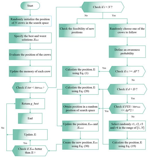 | Step 1. Initialization Randomly initialize the location of N-group crows in the search space Assess the location of crows Initialize the memory of crows Specify the best and worst solutions and Step 2. Main loop while () for i = 1:N Randomly choose a crow to follow Define perception probability if Calculate the position using Equation (1) else for d = 1:D if = a random position of search space else
