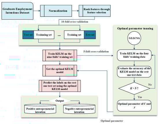 According to the study, the performance of the classifier is affected greatly by its inner parameters and the features in the data. Metaheuristics have great effectiveness in solving this type of problem as shown in many works [28,29,30,31,32], such as object tracking [33,34], the traveling salesman problem [35], gate resource allocation [36,37], multi-attribute decision-making [38,39], the design of the power electronic circuit [40,41], fractional-order controllers [42], medical diagnoses [43,44], big data optimization problems [45], green supplier selections [46], economic emission dispatch problems [47], scheduling problems [48,49], and combination optimization problems [50]. This study proposes an enhanced crow search algorithm (CSA) [51] to simultaneously optimize the hyperparameters of the kernel extreme learning machine (KELM) and the feature space for predicting the entrepreneurial intention of college students. The CSA is a novel-inspired metaheuristic method proposed in 2016 and has resolved many complex optimization problems [51], with many researchers attempting to boost it from different aspects [52,53,54,55,56]. For example, Adamu et al. [57] proposed a hybrid particle swarm optimization with the CSA for feature selection, and the result of the proposed model gained an accuracy of 89.67% on 15 datasets. Aliabadi et al. [58] designed an improved CSA to optimize a hybrid renewable energy system in radial distribution networks, and the results showed significant active losses and voltage deviations. Al-Thanoon et al. [59] adopted the CSA for big data classification, and the results showed a higher classification performance compared with other algorithms. Awadallah et al. [60] developed a cellular CSA with topological neighborhood shapes to resolve three real-world problems. Bakhshaei et al. [61] designed a boosted CSA-based tournament selection strategy, and the results showed that the optimal determination of power exchange and the incentive rate could lead to decreasing operation costs. Chaudhuri et al. [62] developed a binary CSA with a time-varying flight length to solve the feature selection problem, and the results showed that the proposed feature selection technique behaved better than other approaches. Geetha et al. [63] designed an enhanced CSA for a forgery detection technique in the image, and the results exhibited that the proposed classification performs better than most algorithms. Guha et al. [64] used the CSA with chaotic mapping for fine-turning the controller and varied the efficacy of the controller in its frequency regulation, as validated. Gupta et al. [65] introduced a novel boosted CSA to predict Parkinson’s disease with an accuracy of 100% and helped patients obtain proper treatment. Hossain et al. [66] developed a hybrid support vector regression and CSA to handle the multi-objective optimization of microalgae-based wastewater treatment. Ke et al. [67] proposed an enhanced CSA to deal with energy optimization problems, and the results showed that the approach can better obtain proper solutions with lower calculation times. Khattab et al. [68] developed a novel crow spiral-based search algorithm to solve the design problem formulated, and the gained results confirmed the success of the filter design. Kumar et al. [69] designed a hybrid CSA with an arithmetic crossover to two real-world engineering optimization problems and gained effective results. Li et al. designed [70] an improved CSA with an extreme learning machine model to effectively forecast short-term wind power.