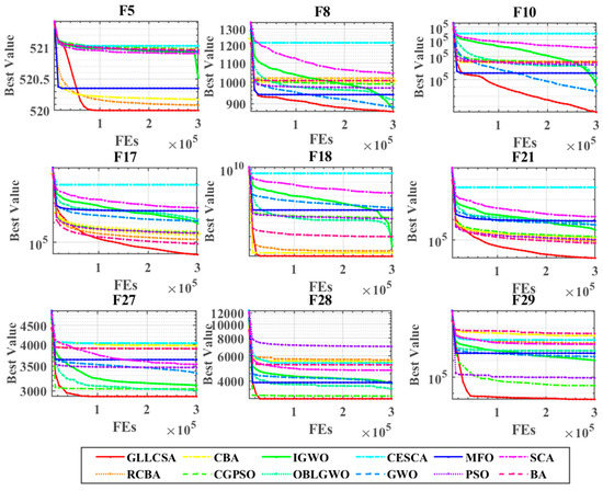 The proposed GLLCSA displays the lowest average value of the 30 functions, and the detailed comparison results of GLLCSA and the other eleven peers can also be seen in Table 5. In other words, the improved algorithm can obtain better results than the other algorithms on every test function. Moreover, the results of F2, F3, F5, F7, F8, F10, F14, F17, F18, F21, F23–F29 bear out the ability of this method to obtain the highest quality solutions. Compared with the other competitive algorithms, the statistical performance of GLLCSA is verified by the CEC 2014 benchmark functions. For further statistical comparison, according to the ARV index, the ranking of the 12 algorithms is shown in Table 6. According to the statistical value of ARV, when searching for the minimum value of the function, GLLCSA is better than the other methods, followed by IGWO, CGPSO, OBLGWO, PSO, BA, GWO, RCBA, CBA, MFO, SCA, and CESCA. In Table 7, the Wilcoxon signed-rank test [101] is given, which indicates whether the difference between GLLCSA and the other algorithms is significant. As can be seen from the table, the experimental results of GLLCSA have a better performance than SCA and CESCA in all test functions. In conclusion, compared with SCA, CESCA, and the other nine algorithms, the GLLCSA achieves the best results for these test functions. In addition, to display the significant advantages of GLLSCA, Figure 3 shows the convergence rates of IGWO, CGPSO, OBLGWO, PSO, BA, GWO, RCBA, CBA, MFO, SCA, and CESCA on 30 benchmarks. As shown in the figure, for the problems of F2, F3, etc., it can be seen from the convergence curve that, compared with the other algorithms, GLLCSA can improve both the convergence speed and the convergence accuracy based on the original SCA. Furthermore, the GLLCSA can reach the optimal solution when dealing with F5, F8, F10, F17, F18, F21, F27, F28, and F29. Since both F12 and F13 are multimodal functions, it is obvious to notice that there are many locally optimal solutions for these two functions. Although GLLCSA also falls into the optimal local solution, its convergence speed and accuracy are optimal when compared to the other algorithms. It is proved that the CSA based on GLL has a good exploration in avoiding LO. Therefore, the GLLCSA has more advantages than the original CSA.