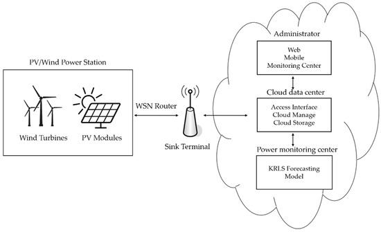 Each sink node receives sets of information, similar to a hub, and merges the information of different data. In the power monitoring center, an access interface is built to receive and evaluate data, as well as process the information stored in the cloud as shown in Figure 1. After receiving the data, the cloud data center runs the KRLS forecasting model to forecast PV and wind power production.