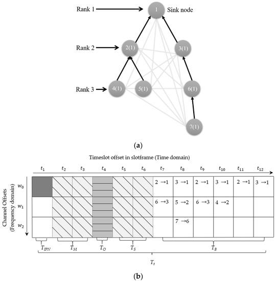 Cell usage of the 6TiSCH wireless network: (a) tree topology in 6TiSCH network; (b) channel offsets for link scheduling in the 6TiSCH network.