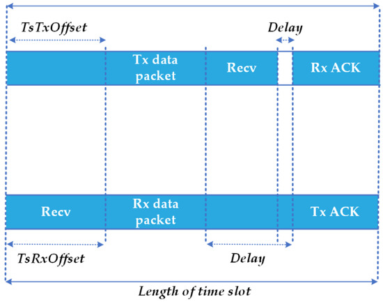 Figure 4 depicts the time slot compliant with the 6TiSCH network standard. The upper time slot is for the Tx (transmitter) and the lower time slot is for the Rx (receiver). After the time interval of TsTxOffset, the data packet is transferred by the transmitting sensor node. The receiving sensor node accepts the incoming data packets before the time period of TsTxOffset. When the data packet is properly received, Rx sends an acknowledge (ACK) signal to Tx after the delay time interval. As a result, a single time slot is used to carry out data packet transmission between a child node and a parent node.