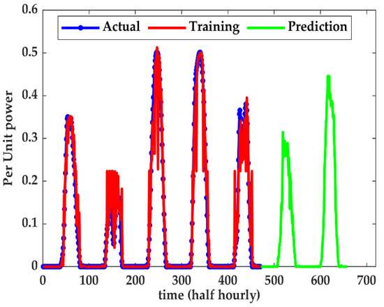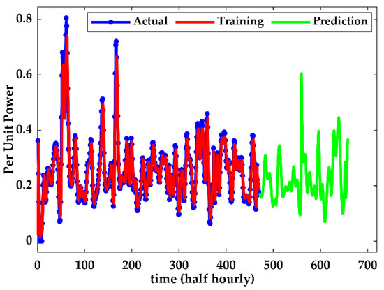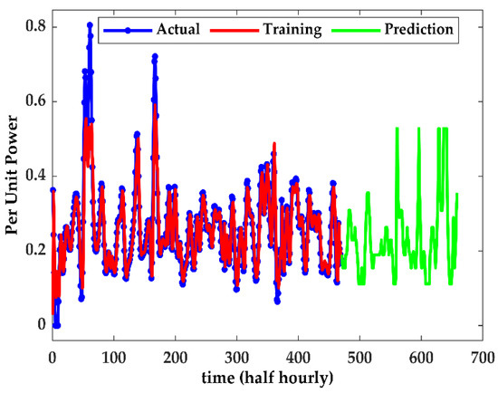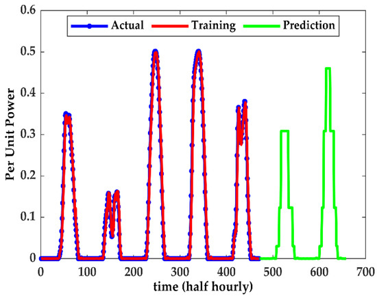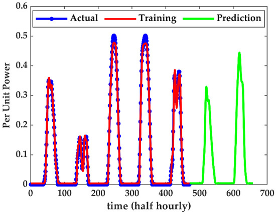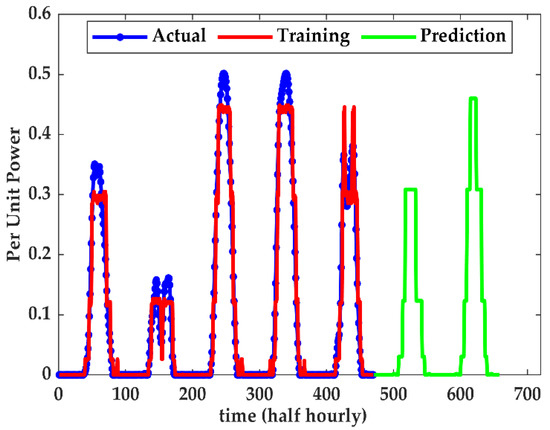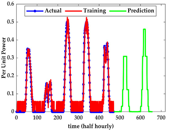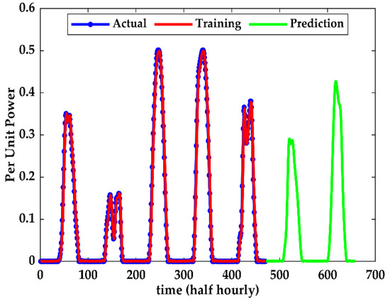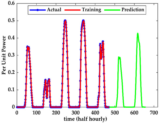 This section presents the efficacy of the proposed KRLS forecasting algorithm and the proposed link scheduling model. Generally, the WSN has sensor nodes and a sink node. The data collected by the cloud data center are used for regression techniques: GPR, LRM, SVM, TR, NN, and LSTM network. Data on PV and wind power on a half-hourly basis was acquired from the Korea Meteorological Administration in South Korea (from 1 January 2019 to 31 December 2019). In total, 70% of the data for one day was selected to be utilized as training and validation data in the proposed forecasting models’ training phase, while the remaining 30% was used to evaluate the prediction performances. MATLAB R2022a was used for WSN and the proposed link scheduling technique. In this section, the proposed PV and wind forecasting model is compared with prediction methods by using regression techniques. To achieve effective power prediction performance, the proposed forecasting model for PV and wind power production utilizes a large training dataset. The prediction result for different regression learning models for both PV and wind systems, viz., GPR, LR, SVM, TR, NN, LSTM, and the proposed forecasting model are shown in Table 2 and Table 3. Figure 6, Figure 7, Figure 8, Figure 9, Figure 10 and Figure 11 represent the actual, training, and forecasting of PV energy using GPR, LR, SVM, TR, NN, and LSTM techniques. Figure 12, Figure 13, Figure 14, Figure 15, Figure 16 and Figure 17 represent the actual, training, and forecasting of wind energy using GPR, LR, SVM, TR, NN, and LSTM techniques.