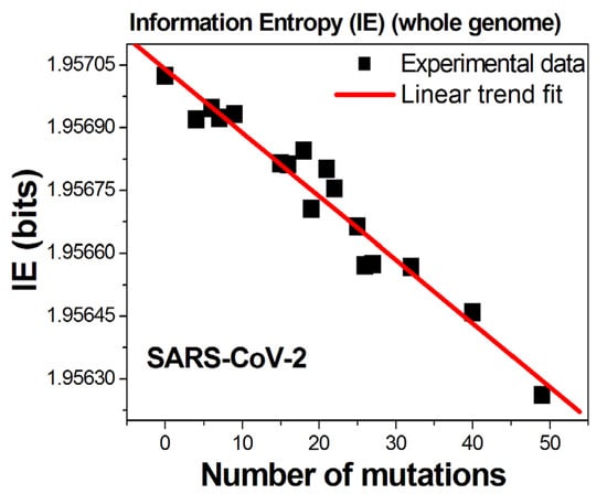 Figure 1 shows the computed IE of each SARS-CoV-2 variant as a function of its number of SNP mutations. Remarkably, the data indicate that the Shannon IE of the RNA genomes decreases linearly with their corresponding number of mutations. The larger the number of mutations, the lower the corresponding Shannon IE value.