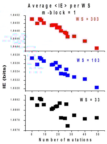 In order to produce an IE profile of the whole genome, one needs to compute the IE value of each window and plot the IE values obtained as a function of the window index location within the genome. The result is an IE spectrum, which is a numerical representation of the genome sequence containing all its biological information converted into a numerical spectrum. Using GENIES [8,9], we computed the IE spectra by counting and working out the probabilities of occurrence of single nucleotides for SS = WS = 103. Figure 2 shows the average IE per window of each SARS-CoV-2 spectrum for three different WS values as a function of the number of mutations. The data indicate again that the average IE per window within each genome decreases with an increase in the number of mutations. The larger the WS values, the better the correlation.