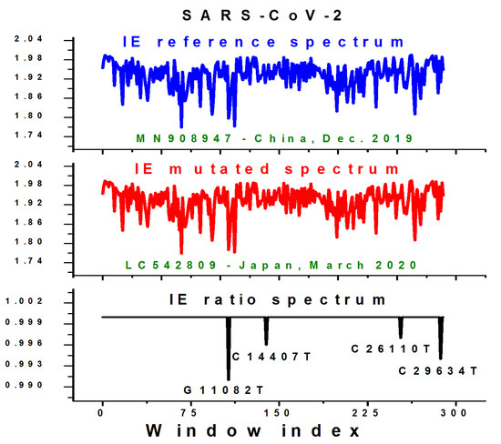 To exemplify this technique, we computed the IE spectrum of the SARS-CoV-2 reference genome (MN908947) and the spectrum of the first mutated variant (LC542809) using WS = SS = 103. We performed a direct comparison of the two genomes, and four SNP mutations were identified in the LC542809 sequence (see Table 1), as follows: G11082T, C14407T, C26110T, and C29634T. The first character is the mutating nucleotide in the reference genome, the number is its location in the sequence, and the second character is what it mutated into in the new sequence.