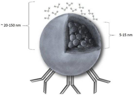 The core of these nanoparticles comprises iron oxide, more commonly magnetite (Fe3O4) or maghemite (γ-Fe2O3), and its radius ranges between 5 and 15 nm [19,20] (Figure 1). Iron oxide itself is hydrophobic; hence, the nanoparticles are usually modified with an external coating formed of a biocompatible hydrophilic polymer such as dextran or polyethylene glycol [7,21]. This coating is essential in order to prevent the opsonisation (i.e., binding with plasma proteins) of the nanoparticles, which would unavoidably occur in the bloodstream without it [19,21]. Additionally, through electrostatic interactions, the coating also inhibits the aggregation of nanoparticles that would otherwise take place due to their hydrophobic properties [19]. Another important consideration is an excess of iron ions may lead to the overproduction of reactive oxygen species or free radicals and subsequently cause protein, lipid, and DNA damage and, finally, cellular apoptosis [22]. Thus, the other critical ‘task’ of the external coating is to provide a stable cover that prevents the oxidation of the iron and its subsequent harmful effects, allowing the safe use of the nanoparticles [22]. Apart from the above, the coating that surrounds the core of the nanoparticle also acts like a ‘harbour’ to which ligands, drug molecules, and other molecular targets can bind [6]. Taking all of these into consideration, it is obvious why molecular imaging and targeted drug delivery are some of the areas where iron oxide nanoparticles have been successfully applied [23,24,25].