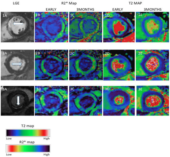 Examples of myocardial oedema and ferumoxytol enhancement in the infarct area after myocardial infarction (MI). Three examples of MI (1, anteroseptal, 2, lateral and 3, inferior) showing LGE on T1-weighted imaging (1A–3A), ferumoxytol enhancement (R2* maps) (1B–3B,1C–3C), and oedema (T2 maps) (1D–3D,1E–3E) at early (up to 10 days in (1B–3B,1D–3D)) and late (3 months in (1C–3C,1E–3E)) post-MI. Early inflammation and oedema seen on R2* maps (dark region) and T2 maps (light region), respectively, have improved or resolved by three months [31]. Reproduced with permission from Stirrat et al. [31] under a Creative Commons Attribution 4.0 International License.