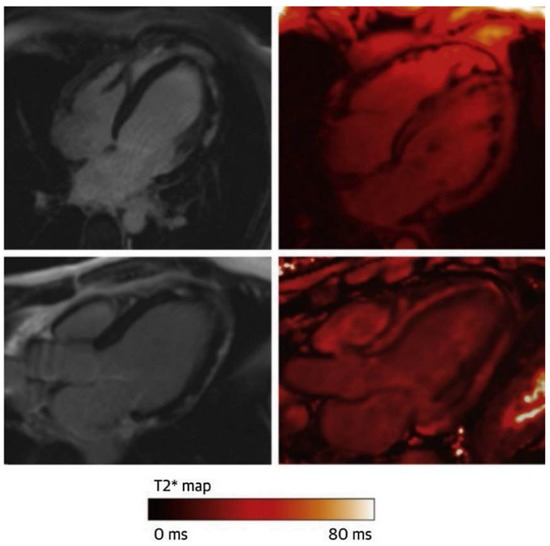 Their impact of iron oxide nanoparticles and, more specifically, USPIO can be quantified by measuring the changes in the T2* and R2* values (R2* = 1/T2*) [1,7]. Uniformly dissolved USPIO alter the relaxation rates, including the R1 (longitudinal magnetic resonance relaxation rate) and R2* (transverse magnetic resonance relaxation rate) [1,36]. Nevertheless, R2* particularly is sensitive to actively phagocytised USPIO, whereas R1 is not [1]. Therefore, the R2*/R1 ratio is extremely useful for differentiating the active USPIO uptake from the passively distributed USPIO [1,7]. In a study by Lagan et al., the ratio of R2*/R1 at 75 h post-USPIO administration was demonstrated to have a 90% sensitivity and 85% specificity for detecting active USPIO uptake in infarcted and remote myocardium in acute myocardial infarction and chronic ischaemic cardiomyopathy [1].