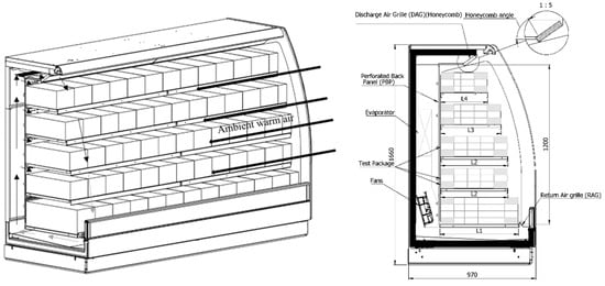 Open-type refrigerated display cabinets are important parts of retail food stores used to ensure proper food storage and trading, as they help to attract buyers and increase sales []. Food products can be stored and displayed to consumers at different temperature levels in such cabinets []. The temperature of food products usually varies between −1 and +7 °C (3M2 temperature category) as described in BS EN ISO 23953-2 [] for chilled food application. This temperature category is suitable for storing milk and dairy products, sandwiches, green salad, and cooked meat products, but is not appropriate for storing minced meat and raw meat. The storage of raw and minced meat requires a temperature between −1 and +4 °C (3M0 temperature category) as described in BS EN ISO 23953-2 [].