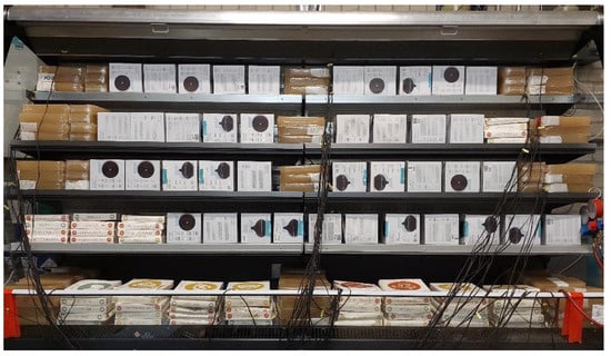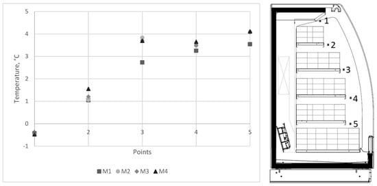Figure 5 presents a picture of the experimental refrigerated cabinet with thermocouples. The open-type display cabinet is loaded with test product packages. The M-packets consist of oxyethylmethylcellulose (dimension in width × height × length: 100 × 50 × 200 mm; according to ISO 15502, ISO 5155, ISO 7371, ISO 8187, ISO 8561 standards). The M-packets freezing point is −1 °C and thermal conditions are like lean beef. The refrigerated cabinet was sliced by three measuring planes: z = 0 m (middle plane); z = −1.0 m (left plane); and z = +1 m (right plane). Thermocouples were positioned at the geometric center of the test product packages. Carel Easy controllers with 3 probes were used in this study. The controllers were connected to the computer with Carel PlantVisor PRO monitoring software (CAREL S.p.A., Padova, Italy). The data collected was represented with Microsoft Excel 2016 (Microsoft Corporation, Redmond, WA, USA) software.