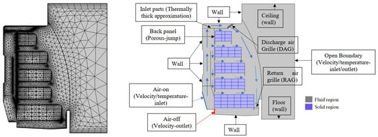 2D mesh applied to the cabinet model (left); the computational domain of the 2D-CFD model for an open display cabinet and the locations of boundary conditions (right).