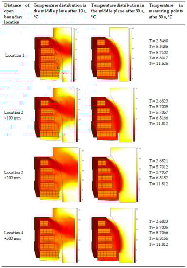 Figure 3 (right) shows the boundary conditions of the computational model. The values used for the boundary conditions are given in Table 3. Air-on and air-off streams are modelled in a closed-loop model. The velocity values are calculated by the fan flow rate and boundary length. The right boundary is defined as the open boundary with both inflow and outflow conditions supported. One of the most important tasks is to set an open boundary location in the horizontal distance to the display case. The distance significantly influences simulation results. Additional studies were conducted to set the location of the open boundary. Figure 4 shows the distance of the open boundary and the temperatures at the measuring points. The measuring points are marked in location 1 (Figure 4, temperature distribution in the middle plane after 10 s). It can be seen that the results are the same in the 2, 3, and 4 studies (Figure 4, locations 2, 3, and 4). Short distance produces worse results of the airflow temperature for the entire simulation time interval. Long distance produces worse results of the airflow temperature at the early air curtain formation time in that the initial model temperature is set to 10 °C. This value of the initial model temperature was chosen by measuring the temperature after the defrosting process of the refrigerated cabinet. The ceiling and floor are considered adiabatic walls. The air temperature is adopted at the one boundary of air-on. The air-on boundary is defined as the velocity inlet, and the air-off boundary is described as the velocity outlet. The products are defined as solid and non-slip boundary conditions. The thin-layer structure was used to model the honeycomb to provide a more accurate flow direction. The wall shelves, the bottom shelf, the back panel, and other parts of the cabinet, were made from steel sheets, through which heat transfer occurs. The wall shelves and the bottom shelf were modelled as thin steel walls with a thickness of 1.4 mm. Other inner parts were modelled as thin steel walls with a thickness of 0.7 mm. The boundary condition of the back panel is defined as a porous jump, with other surfaces being walls. Lastly, there is strong natural convection between the refrigerator and the ambient air affected by the density of air at different temperatures. To simulate this natural convection, gravity was activated in the models and the density of the air was calculated based on the ideal gas formulas.