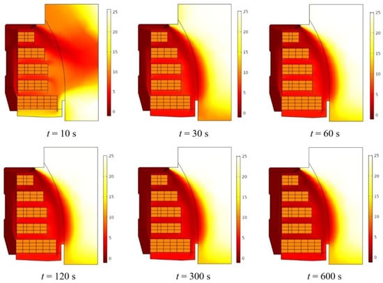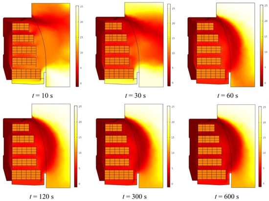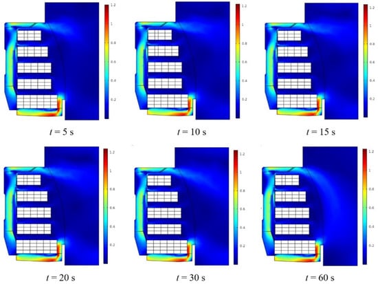 Figure 7 represents the complete formation of the air curtain in the middle plane of the modified cabinet with a changed honeycomb angle and length of wall shelves (Figure 1 (right), Table 1). The honeycomb was turned 15 degrees clockwise (Table 1, Figure 1). It can be seen from Figure 7 that unlike the case of an unmodified cabinet (Figure 6), the air curtain is formed in the outside contour of the cabinet, which is represented by a solid black line in Figure 6 and Figure 7. The air curtain is formed after 20 s only, that is, three times faster than in the unmodified cabinet case (Figure 6). The airflow velocity values obtained are similar to those obtained for the unmodified cabinet (Figure 6). A significant difference is observed only in the formation time and position of the air curtain. The ambient air infiltration ratio is less than in the case of an unmodified cabinet due to the shorter air curtain and the cold air travel time.