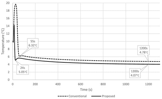 Figure 11 presents the intake air temperature change graph obtained for the middle planes of the unmodified and modified cabinets in a time-dependent study. The simulation results obtained for the unmodified refrigerated cabinet show that the intake temperature after 20 min of operation is approximately 4.78 °C in the intake grille (RAG, Figure 1). However, in the modified one, the temperature is about 4.07 °C. The higher temperature of the intake air means that the evaporator works under worse conditions. This causes evaporator icing. On the other hand, the intake temperature has an impact on the front products of the bottom shelf, and it is necessary to keep the temperature as low as possible.