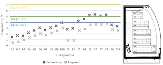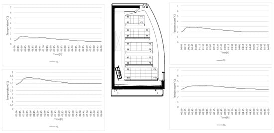 Figure 13 presents the distribution of the M-packets temperatures measured in the middle plane of the modified refrigerated cabinet. The average cooling temperature for a 6 h cycle was −1 °C. In all M-packets, the temperature does not reach +4.5 °C (3M0 temperature category, tolerance +0.5 °C). Comparing the results of CFD and experimental results, the maximum difference in temperatures was 9.33% (Table 4).