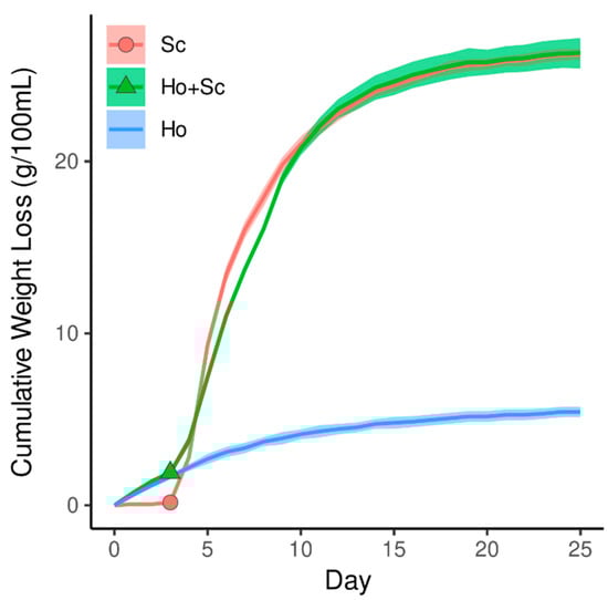 Cumulative weight loss of the Hanseniaspora occidentalis-initiated fermentations. After three days, Saccharomyces cerevisiae was added to three bottles inoculated with H. occidentalis and three uninoculated as indicated by points on the weight-loss curve. Continuous lines represent the mean value of three fermentation replicates, and the shaded area represents their standard deviation.