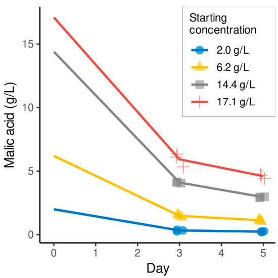 In a subsequent fermentation, we tested the ability of H. occidentalis to consume malic acid at different starting concentrations. H. occidentalis was inoculated with different versions of the same must with increased amounts of malic acid (2.0–17.1 g/L), and the consumption of this acid was assessed after three and five days (Figure 2). H. occidentalis removes the majority of malic acid after three days of fermentation: in the lower starting concentration of 2.0 g/L, 88% was removed from the must. From the must containing 17.1 g/L of malic acid, H. occidentalis consumed 65% and 73% after three and five days, respectively.
