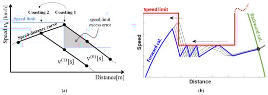 For the distance integration of backward calculation, is negative value, so that the radicand of Equation (11) is positive. So the speed curve reversely increases as Figure 2a by the deceleration value of . In short, the train virtually moves backwards to determine the exact breaking point of moving the train in forward direction.