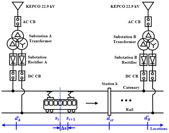 In this section, an effect of traction and breaking motion on DC railway power system especially voltage aspect are introduced. The location for substations are marked in Figure 9a, and the study region of this paper is between substation A and B.