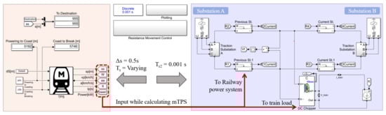 Using those specifications, the overall schematic structure for the model-based TPS is constructed as shown in Figure 8. The train moving model was partially used from previous research [20]. The program runs at multiple rates in time and distance. First, the mTPS model is represented in the top; the red box has s = 0.5 s and varying . Where the s stands for increment of distance. The cause of varying time step has been described at Section 2.2.