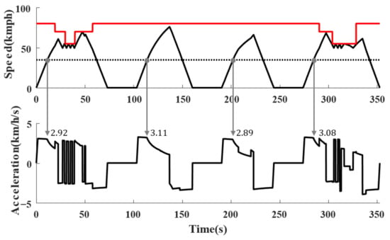 In the speed-time curve, there is a dwelling time for 30 s, so the train stops at the station. It is clear that the acceleration is around 3.0 km/h/s at a speed of 35 km/h, which is defined in Figure 7. Those changing points are formed due to the vehicle driving mode changing from constant torque to constant power mode. Meanwhile, some differences were made due to train curve or gradient resistance.