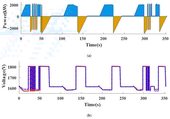 Figure 11a shows the result of the power aspect of the 1500 V dc metro system with mTPS. Most of the train has an auxiliary power so the power-time curve is biased for 130 kW. Figure 11b represents the voltage at the substation A (red line) and B (blue line). Obviously, the rise of voltage is observed during breaking mode, but as the braking chopper operates it is limited to 1800 V. And for the powering section, the voltage drops due to approximately 2 MW train load. Specifically, when the train is in powering mode, the voltage is higher near substation A and vice versa. Its obvious because the train load current travels a shorter distance than the opposite side substation.