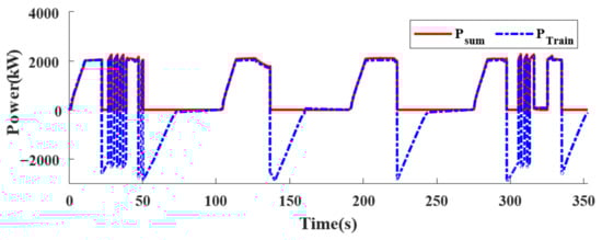 Comparison between sum of power of substation A, B and train load power in time.