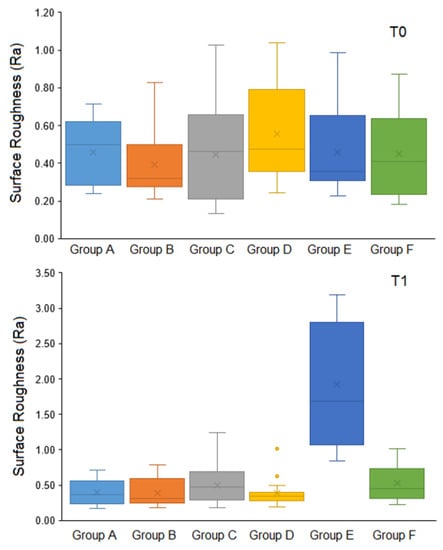 The comparison of Ra showed a non-significant difference between the groups at T0 (H = 3.79, p = 0.579). In contrast, there was a statistically significant difference in Ra between groups at T1 (H = 38.7, p < 0.0001) (Kruskal–Wallis test). Pairwise comparison using the Mann–Whitney test demonstrated a significant difference between Group E and the remaining study groups (p < 0.0001).