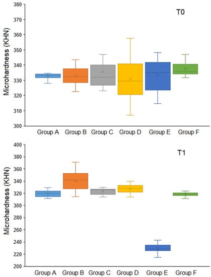 Table 3 presents the significant difference in median KHN within the groups and between the groups at T0 and T1 measurement intervals. The comparison of KHN within the groups from T0 to T1 revealed a significant decrease in the hardness for Groups A, C, E, and F (p = 0.001). Group B specimens showed increased KNH from T0 to T1; however, the difference was not statistically significant (p = 0.112). Similarly, group D specimens demonstrated a nonsignificant decrease in KHN from T0 to T1 (p = 0.29).