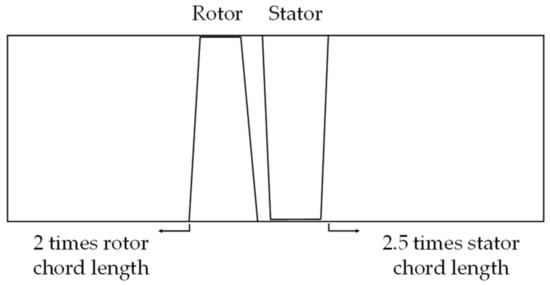 The numerical simulations are considered a transonic stage designed for this work, with its meridian view illustrated in Figure 1. The compressor comprises a transonic rotor and a cantilevered stator. The radial clearance of the stator has been optimized to the appropriate size to ensure that only traditional hub leakage flow exists in the region. Meanwhile, no corner separation occurs from choke to stall according to the study by Liu et al. [30]. The entire stage also contains an inlet guide vane (IGV), which is omitted in this study to reduce calculations. The hub and shroud radii are constant from the inlet to the outlet. Furthermore, to weaken the influence of numerical reflection on the transient results, the inlet boundary is two times the rotor chord length upstream of the rotor leading edge (LE), and the outlet boundary is 2.5 times the rotor chord length downstream of the stator trailing edge (TE). The basic geometric parameters are reported in Table 1.