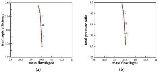Figure 2 depicts steady compressor characteristics, with Figure 2a,b presenting the efficiency and total pressure ratio as a function of mass flow. Since the rotor is transonic and the stator has a premature high load at the end wall due to the constant radius flow path, the characteristic line is steep with a low flow margin. The three operating points A, B, and C, whose averaged back pressure is 118 kPa, 123 kPa, and 128 kPa, are considered as the low load (LL), nominal load (NL), and high load (HL) conditions, respectively. The incidence along all spans at B is about zero, while A and C have negative and positive incidence conditions, respectively. The three points are simulated to explore the unsteady interaction as a typical case.