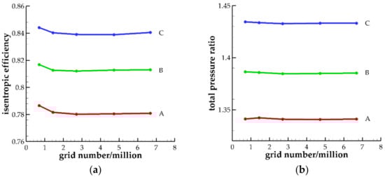 Validation of grid independence of the research compressor. (a) Isentropic Efficiency; (b) Total Pressure Ratio.