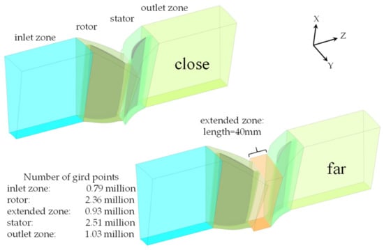 All cases are considered as single-passage computations in this work, and NUMECA/AUTOGRID5 generates the structured mesh. The fluid domain is divided into four subdomains considering a “close” geometry and five subdomains for “far” geometry. The O4H-type mesh is generated at the rotor and stator zones, and an H-type mesh for the other three subdomains. The height of the first layer from the solid surface is set to 1 × 10−6 m, ensuring that y+ is approximately 1.0. At the chosen three operating conditions, grid independence is validated through five groups of grid settings that are progressively refined in every direction, as shown in Figure 3. The influence of grid number on mass flow is less than one-thousandth and can be ignored. The performance parameters are basically unchanged after the grid number exceeds 2.71 million. To obtain a more accurate unsteady flow, we used the highest density mesh, with the O-type mesh around the blade comprising 36 layers and the radial grid nodes set to 101 and 109 for the rotor and stator, respectively. Additionally, the clearance of rotor and stator involve 25 and 33 nodes, respectively, with the total grid nodes being about 6.69 million for the “close” geometry and 7.62 million for the “far” geometry. The detailed number of grid nodes per fluid subdomain is illustrated in Figure 4.